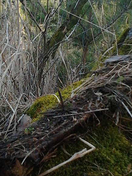 který trčel kolmo vzhůru z nějaké latě ležící na zemi v loňské trávě.
