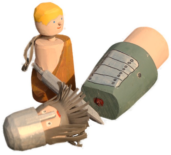 Tak David přemohl onoho Filištína prakem a kamenem. Zasáhl Filištína a zabil ho, i když neměl žádný meč. Potom David přiběhl a stanul nad Filištínem, chytil jeho meč, vytáhl ho z pochvy a dorazil ho - usekl mu hlavu.