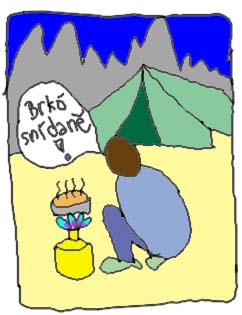 Vaření bylo v Dolomitech kupodivu většinou záležitostí chlapskou. Ne, že by bylo nutno začít skácením stromu na podpal, spíš asi proto, že něžnému ženskému tělu se po přestálých útrapách minulého dne nechtělo příliš z útulného spacáku, navíc při pomyšlení, že do 7:00 musí být všechny stany stržené. Jednoho rána se otec Pavel zrovnal chystal vyplísnit opozdilce. Když mu jeho spolubydlící tiše naznačil, že i jejich stan dosud stojí, komentoval to zvučným k..... . Ano, můžete se uklidnit, těch teček je opravdu pět. |