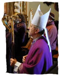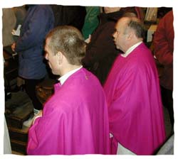 Bohoslužba slova uplynula v obvyklém pořádku, dým kadidla stoupá vzhůru, drobné kapičky sraženého dechu klesají k zemi. Následuje vyznání víry a sliby obou kandidátů. Pak litanie ke všem svatým. Zatímco litanie si zachovává stále stejné tempo, krevní oběh v okrajových částech těla se nám poněkud zpomaluje.