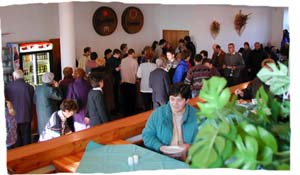 Postupně vychází Slunce a ze dvou autobusů nekonečný zástup farníků z Troubska, Slunce se rozlévá po kraji, lidé po pivnici.