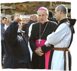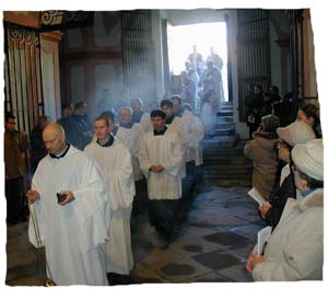 9:45 kostel je plný, trapističtí mniši zpívají chórovou modlitbu, lidé kvapně sahají po brožurkách, ve kterých mohou sledovat nadcházející obřady. Po chórové modlitbě zaznějí varhany a přichází průvod uzavřený Otcem biskupem. Mše svatá může začít.