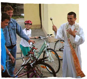 Přijíždějte na kolech. Zřetelný posuv k ekologii jsme v naší farnosti zaznamenali neděli před statodušními svátky. Zatímco loni žehnal otec Pavel motorová vozidla farníků, letos se konalo žehnání jízdních kol. V krátkém obřadu jsme uslyšeli úryvek z evangelia o Mariině cestě k Alžbětě. Celkem právem se ptáte, proč za patronku cyklistů byla vybrána právě Maria, která se za svou příbuznou vydala přece pěšky? To je sice pravda, ale uvažte, že v té době ještě nebyla výroba horských kol ani v plenkách. Většina moderních exegetů se shoduje v názoru, že v dnešní době by Maria určitě pro svou cestu použila horské kolo. Naše redakce si je téměř jista, že při příštím zjevení naše Matka řekne přijíždějte na kolech. Po obřadu bylo nutno posvěcená kola vyzkoušet. Vypravili jsme se proto na pouť ke kapli Matky Boží na hradě Veveří. Panna Maria nad námi držela ochrannou ruku perfektně, všichni se bez nehody propletli poměrně hustým provozem kolem brněnské přehrady. Na druhé straně bylo vidět, že s cyklistickými poutěmi zatím nemáme moc zkušeností. Nevíme, co s korouhvemi, jak se modlit cestou, když se neslyšíme. Navíc občas není dechu nazbyt, natož ještě růženec. Při příjezdu na místo někteří očekávali pokračování obřadu. Otec Pavel si buďto myslel, že už to pro dnešek stačilo, nebo ve svých liturgických textech prostě obřad pro dojezd cyklistů s posvěcenými koly neměl. |
