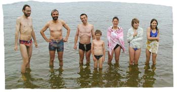 Opravdu nic to není, voda je teplá, jasně čteme z úsměvu nejmladšího otužilce Marka. Neméně obdivu zaslouží i maminka, která výkonu statečně přihlížela. Není to samozřejmost, některé přinesené plavky zůstaly bohužel suché. Na tomto místě nutno naopak ocenit statečnost postižených a vzdát nejméně tentýž hold bezejmenným hrdinům, kteří dali přednost synovské poslušnosti před touhou předvést svoji chrabrost. |