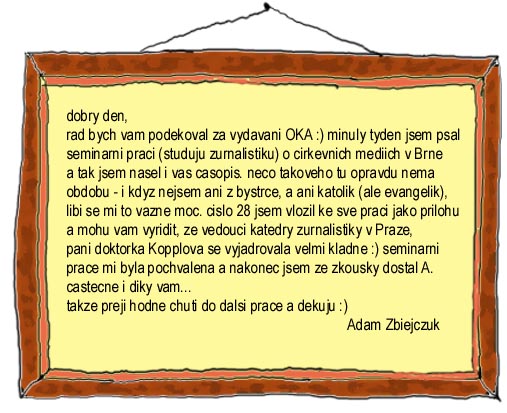 Injekce. Neměli bychom se chlubit, ale na druhé straně je to především vaše zásluha naši milí známí i neznámí čtenáři, naši příznivci i odpůrci. Dnes vás můžeme potěšit. Máte opravdu dobrý vkus, že jste si vybrali na čtení právě Oko. No a ti, kteří nám dokonce něčím přispěli, se mohou radovat dvakrát. Právě jsme totiž dostali něco jako povzbuzující koňskou injekci. Až máme strach, že nám z toho odumře noha. Nedejte si něco takového za rámeček! |