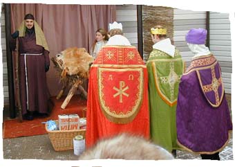 Tříkrálové svěcení. V předvečer svátku Zjevení Páně jsme se sešli na svěcení vody, kadidla, křídy a soli. Tento pěkný obřad doprovodil otec Pavel pěknou promluvou. Nejprve připomenul různé lidové zvyky používající tyto posvěcené substance. Kadidlem se vykuřoval dům i chlévy, hospodyně vzala tři klasy a vykropila dům, posvěcenou křídou se značila futra známou trojicí písmen K,M,B, březí krávě se dávaly tři lžíce svěcené vody do tlamy, svěcenou vodou se kropila pole. Na Tři krále se děvčata a chlapci koupali ve sněhu. Promluvu zakončil Reynkovým Klaněním Svatých tří králů. ... a píseň srdce Ježíškova chválí Ducha, z kterého byl počat, mléko Panny Marie, a Josefovu prostotu a útrpnost hovádek a víru, naději a lásku Králů Mudrců. A tato píseň je tak slastná, že Kůrové andělští se shlukli kol jeskyně v přemocnou, průhlednou a rozvětvenou věž, aby píseň nepronikla k ostatním lidem, poněvadž by potom příliš mnozí umírali tesknotou. |